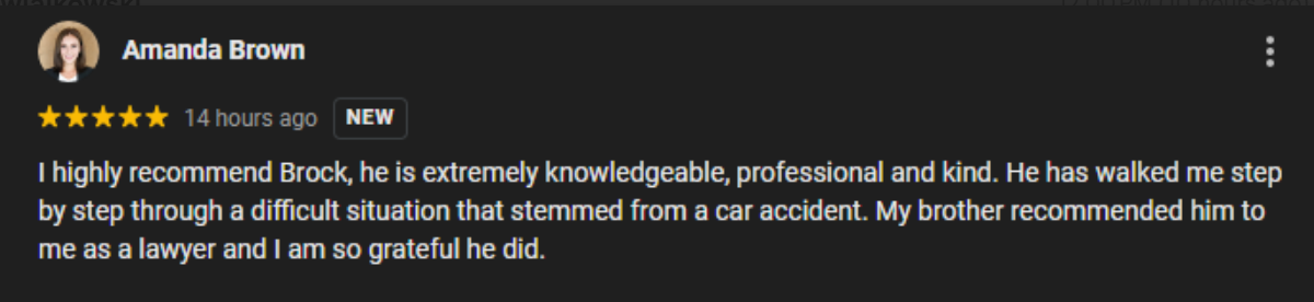 “Brock has exponentially met and exceeded any and all expectations I could have in an attorney. Not only has he guided and paved the way to make things as easy and stress free as possible during my recovery and trauma caused by the accident. His hard work, dedication, and communication has earned him a 5 star review. Thank you Brock for fighting for me 100%. Beyond the best to say the least.”